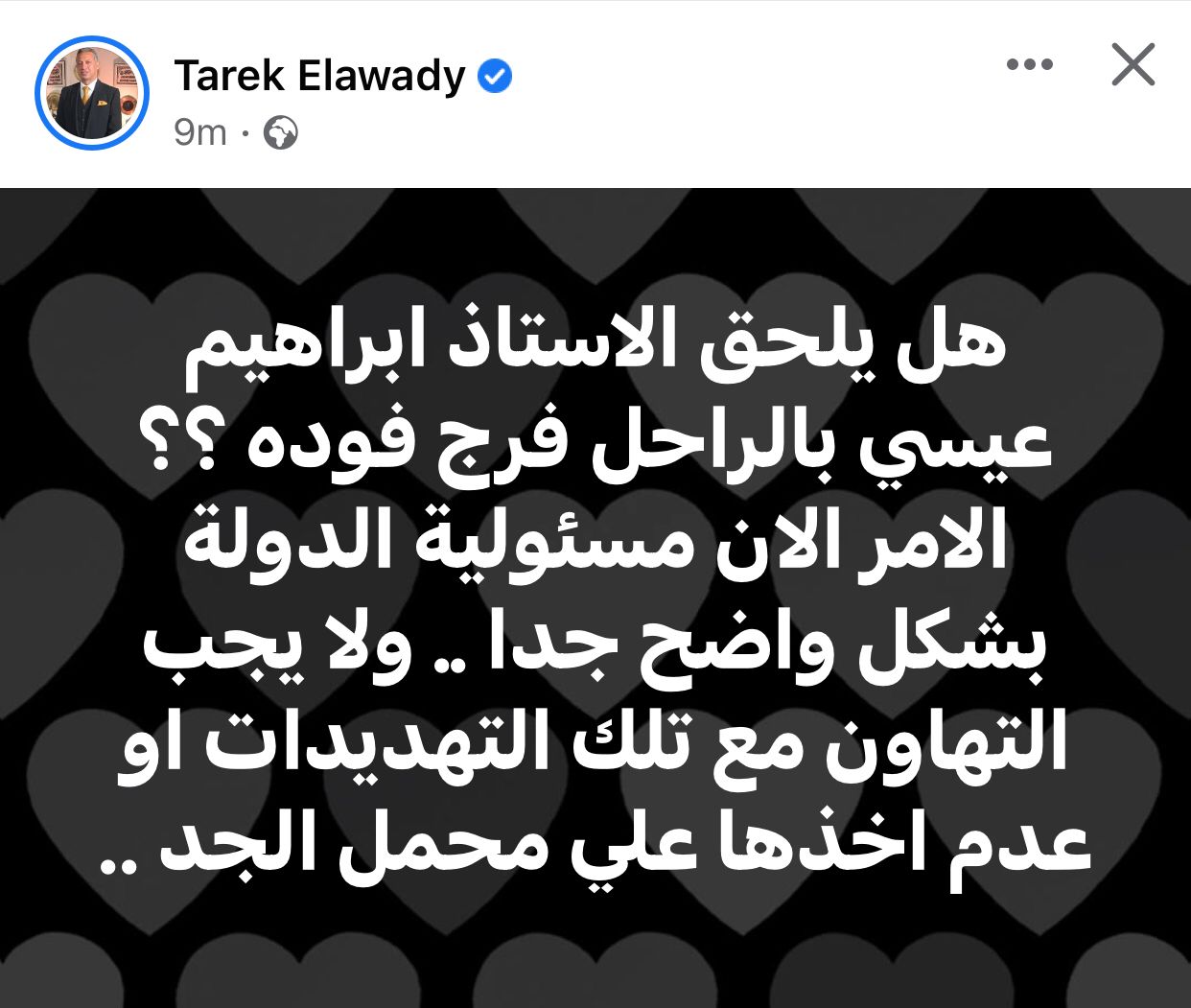 وقال " العوضي" عبر صفحته الشخصية علي موقع التواصل الاجتماعي " فيس بوك"،" هل يلحق الاستاذ ابراهيم عيسي بالراحل فرج فوده ؟؟الامر الان مسئولية الدولة بشكل واضح جدا .. ولا يجب التهاون مع تلك التهديدات او عدم اخذها علي محمل الجد".