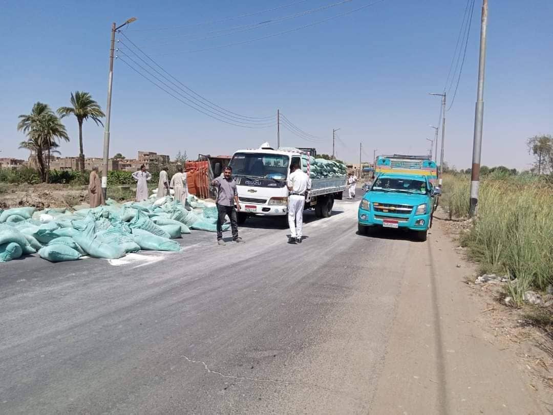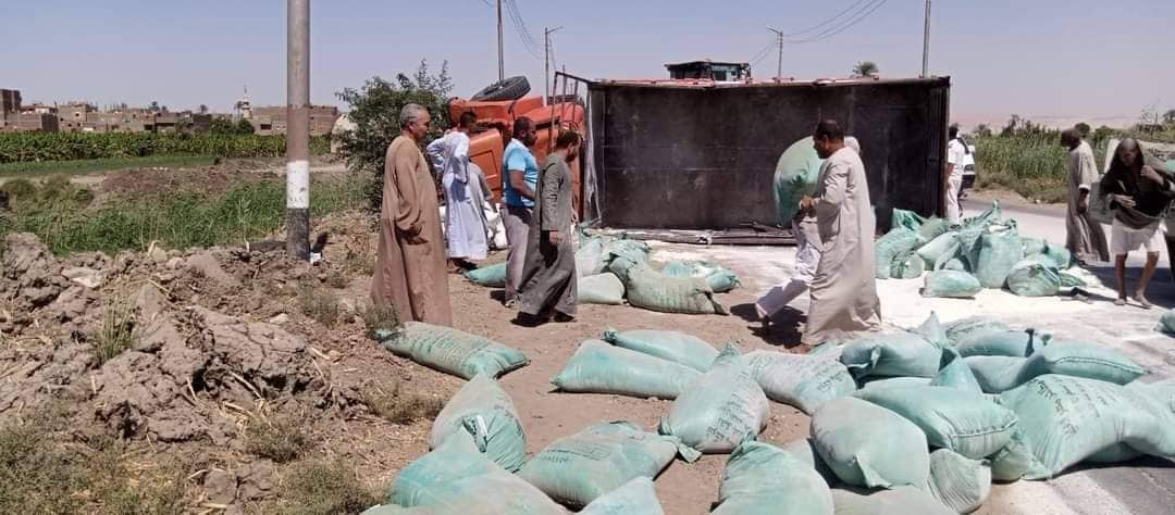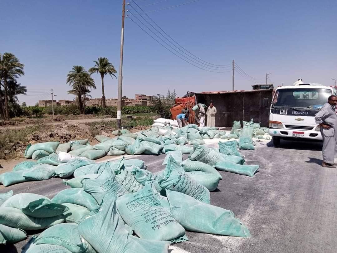 انقلاب سيارة محملة بـ 12 طن دقيق مدعم في قنا (صور)