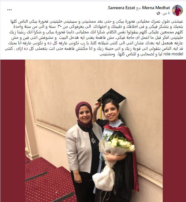 وتابعت ابنة الدكتورة سميرة عزت ،" . مش فاهمة يعنى ايه هدخل البيت و مشوفش انتى فين و مش عارفه هنعمل ايه بعدك عشان انتى الى كنتى شيلانه كلنا. يا رب تكونى عارفه كل ده و تكونى عارفه انا بحبك قد ايه. الناس بتقولى انى قوية زيك و انى حنينة زيك و انا مكنتش فاهمه حتى انت بتعملى كل ده ازاى . كنتى role model ليا و لصحابى و للناس كلها. وحشتينى".