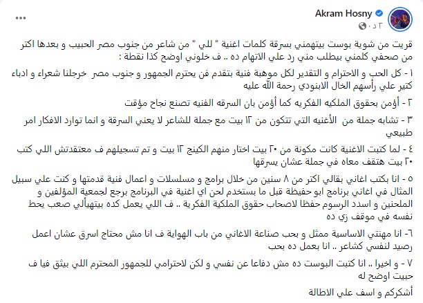 وكتب أكرم حسني: "قريت من شوية بوست بيتهمني بسرقة كلمات اغنية " للي “ من شاعر من جنوب مصر الحبيب و بعدها اكتر من صحفي كلمني بيطلب مني رد علي الاتهام ده .. ف خلوني اوضح كذا نقطة”.