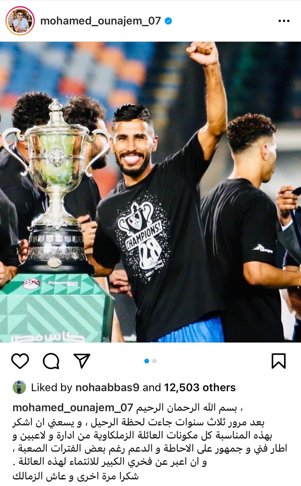 ودع المغربي محمد أوناجم المحترف فى صفوف نادى الزمالك، جماهير القلعة البيضاء، وذلك بعد التتويج ببطولة كأس مصر نسخة 2021 على حساب النادي الأهلي .