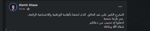 وكتب الأمير أباظة عبر حسابه الرسمي على موقع التواصل الاجتماعي فيس بوك: “المخرج الكبير علي عبد الخالق الذي أمتعنا بأفلامه الوطنية والاجتماعية الراقية يمر بأزمة صحية، اجعلوا له نصيبا من دعائكم، شفاه الله وعافاه”.