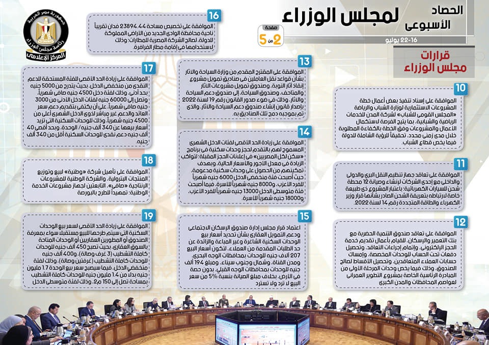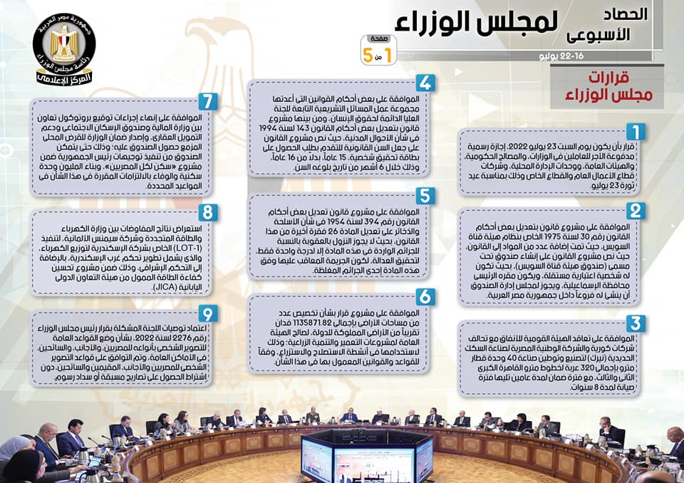 وجاء في التقرير أنه تم إصدار عدد من القرارات، تشمل قراراً بأن يكون يوم السبت 23 يوليو 2022، إجازة رسمية مدفوعة الأجر للعاملين في الوزارات، والمصالح الحكومية، والهيئات العامة، ووحدات الإدارة المحلية، وشركات قطاع الأعمال العام والقطاع الخاص وذلك بمناسبة عيد ثورة 23 يوليو، بالإضافة إلى الموافقة على مشروع قانون بتعديل بعض أحكام القانون رقم 30 لسنة 1975 الخاص بنظام هيئة قناة السويس، حيث تمت إضافة عدد من المواد إلى القانون، حيث نص مشروع القانون على إنشاء صندوق تحت مسمى (صندوق هيئة قناة السويس)، بحيث تكون له شخصية اعتبارية مستقلة، ويكون مقره الرئيسي محافظة الإسماعيلية، ويجوز لمجلس إدارة الصندوق أن ينشئ له فروعاً داخل جمهورية مصر العربية، فضلاً عن الموافقة على بعض أحكام القوانين التي أعدتها مجموعة عمل المسائل التشريعية التابعة للجنة العليا الدائمة لحقوق الإنسان، ومن بينها مشروع قانون بتعديل بعض أحكام القانون 143 لسنة 1994 في شأن الأحوال المدنية، حيث نص مشروع القانون على جعل السن القانونية للتقدم بطلب الحصول على بطاقة تحقيق شخصية، 15 عاماً، بدلاً من 16 عاماً، وذلك خلال 6 أشهر من تاريخ بلوغه السن، وكذلك الموافقة على مشروع قانون تعديل بعض أحكام القانون رقم 394 لسنة 1954 في شأن الأسلحة والذخائر على تعديل المادة 26 فقرة أخيرة من هذا القانون، بحيث لا يجوز النزول بالعقوبة بالنسبة للجرائم الواردة في هذه المادة إلا لدرجة واحدة فقط، لتحقيق العدالة، لكون الجريمة المعاقب عليها وفق هذه المادة إحدى الجرائم المغلظة، كما تمت الموافقة على مشروع قرار بشأن تخصيص عدد من مساحات الأراضي بإجمالي 1135871.82 فدان تقريباً من الأراضي المملوكة للدولة، لصالح الهيئة العامة لمشروعات التعمير والتنمية الزراعية؛ وذلك لاستخدامها في أنشطة الاستصلاح والاستزراع، وفقاً للقواعد والقوانين المعمول بها في هذا الشأن، بجانب الموافقة على تخصيص مساحة 23894.44 فدان تقريباً ناحية محافظة الوادي الجديد من الأراضي المملوكة للدولة، لصالح الشركة المصرية للمطارات؛ وذلك لاستخدامها في إقامة مطار الفرافرة.
