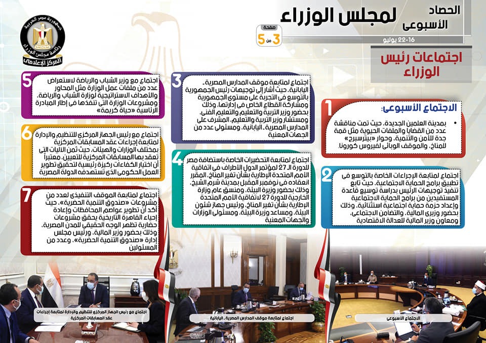 وعلى صعيد الاجتماعات التي عقدها الدكتور مصطفى مدبولي رئيس مجلس الوزراء، أوضح التقرير أنه تم عقد اجتماع لمتابعة الإجراءات الخاصة بالتوسع في تطبيق برامج الحماية الاجتماعية، حيث تابع تنفيذ توجيهات الرئيس بدراسة توسيع قاعدة المستفيدين من برامج الحماية الاجتماعية وإعداد حزمة حماية اجتماعية استثنائية، وذلك بحضور وزيري المالية، والتضامن الاجتماعي، ومعاون وزير المالية للعدالة الاقتصادية، بالإضافة إلى اجتماع لمتابعة موقف المدارس المصرية ـ اليابانية، حيث أشار إلى توجيهات رئيس الجمهورية بالتوسع في التجربة على مستوى الجمهورية ومشاركة القطاع الخاص في إدارتها، وذلك بحضور وزير التربية والتعليم والتعليم الفني، ومستشار وزير التربية والتعليم، المشرف على المدارس المصرية ـ اليابانية، ومسئولي عدد من الجهات المعنية، فضلاً عن اجتماع لمتابعة التحضيرات الخاصة باستضافة مصر للدورة الـ 27 لمؤتمر الدول الأطراف في اتفاقية الأمم المتحدة الإطارية بشأن تغير المناخ، المقرر انعقاده في نوفمبر المقبل بمدينة شرم الشيخ، وذلك بحضور وزيرة البيئة، ومنسق عام وزارة الخارجية للدورة 27 لاتفاقية الأمم المتحدة الإطارية بشأن تغير المناخ، ورئيس جهاز شئون البيئة، ومساعد وزيرة البيئة، ومسئولي الوزارات والجهات المعنية، وكذلك اجتماع مع وزير الشباب والرياضة لاستعراض عدد من ملفات عمل الوزارة مثل المحاور والأهداف الاستراتيجية لوزارة الشباب والرياضة، ومشروعات الوزارة التي تنفذها في إطار المبادرة الرئاسية "حياة كريمة"، وكذلك اجتماع مع رئيس الجهاز المركزي للتنظيم والإدارة لمتابعة إجراءات عقد المسابقات المركزية بمختلف الوزارات والهيئات، حيث ثمن الآليات التي تعقد بها المسابقات المركزية للتعيين، معتبراً أن اختيار الكفاءات ركيزة رئيسية لتحقيق تطوير العمل الحكومي الذى تستهدفه الدولة المصرية.
