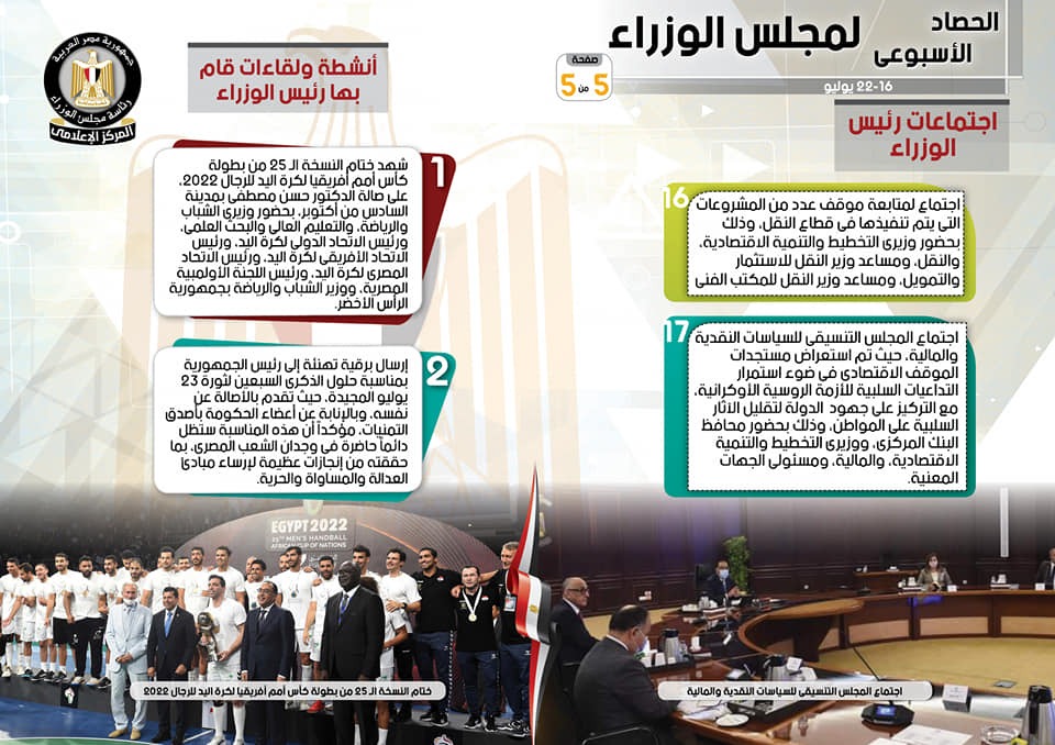 وبشأن الأنشطة التي قام بها رئيس مجلس الوزراء، فبحسب التقرير، شهد سيادته ختام النسخة الـ 25 من بطولة كأس أمم أفريقيا لكرة اليد للرجال 2022، على صالة الدكتور حسن مصطفى بمدينة السادس من أكتوبر، بحضور وزيري الشباب والرياضة، والتعليم العالي والبحث العلمي، ورئيس الاتحاد الدولي لكرة اليد، ورئيس الاتحاد الأفريقي لكرة اليد، ورئيس الاتحاد المصري لكرة اليد، ورئيس اللجنة الأولمبية المصرية، ووزير الشباب والرياضة بجمهورية الرأس الأخضر، كما قام سيادته بإرسال برقية تهنئة إلى رئيس الجمهورية بمناسبة حلول الذكرى السبعين لثورة 23 يوليو المجيدة، حيث تقدم بالأصالة عن نفسه، وبالإنابة عن أعضاء الحكومة بأصدق التمنيات، مؤكداً أن هذه المناسبة ستظل دائماً حاضرة في وجدان الشعب المصري، بما حققته من إنجازات عظيمة لإرساء مبادئ العدالة والمساواة والحرية.