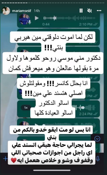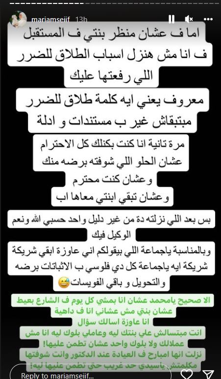 وأعادت مريم سيف نشر إحدى الرسائل تعليقاً على ما قالته جاء فيها: "نسي لما كان بيطلع يقول مكنتش بلاقي الـ 10 جنيه في جيبي وبركب رجلي علشان معيش حق المترو وغيره وغيره".