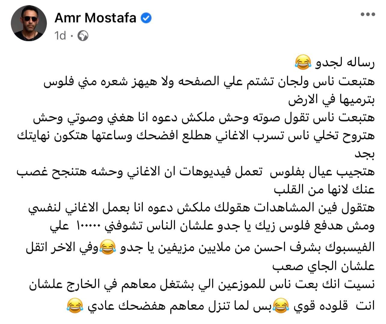 ونشر عمرو مصطفي قائلا ،" رساله لجدو هتبعت ناس ولجان تشتم علي الصفحه ولا هيهز شعره مني فلوس بترميها في الارض ..هتبعت ناس تقول صوته وحش ملكش دعوه انا هغني وصوتي وحش ..هتروح تخلي ناس تسرب الاغاني هطلع افضحك وساعتها هتكون نهايتك بجد ..هتجيب عيال بفلوس تعمل فيديوهات ان الاغاني وحشه هتنجح غصب عنك لانها من القلب".