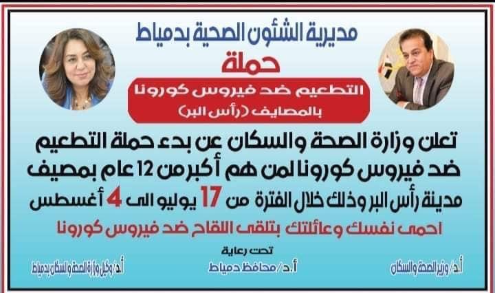أطلقت مديرية الصحة بدمياط، حملة "طرق الأبواب" بمدينة رأس البر، والتي تستهدف الوصول إلى أكبر عدد ممكن من المواطنين لتطعيمهم بلقاح كورونا، كما تأتي تلك الحملة ضمن حرص وزارة الصحة والسكان للوصول إلى المواطنين المستهدفين، فيما فوق 12 سنة بالتطعيم بالجرعات الأولى والثانية والتنشيطية الثالثة والرابعة بلقاحات فيروس الكورونا بمدينة رأس البر نظرًا لإقبال المصطافين عليها خلال فترة الصيف من مختلف المحافظات، وذلك تحت رعاية الدكتور خالد عبد العفار، وزير التعليم العالي والبحث العلمي والقائم بأعمال وزارة الصحة والسكان، والدكتورة منال عوض، محافظ دمياط.