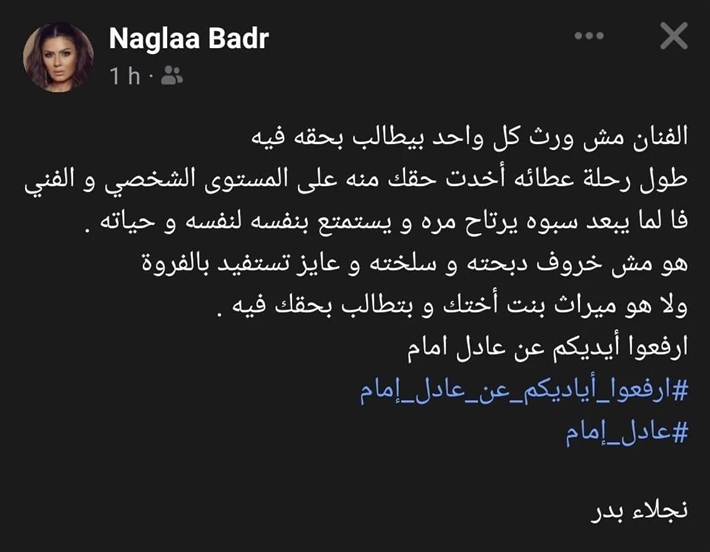 وكتبت نجلاء بدر عبر صفحتها بموقع التواصل الاجتماعي “فيس بوك”: "الفنان مش ورث كل واحد بيطالب بحقه فيه، طول رحلة عطائه أخدت حقك منه على المستوى الشخصي والفني ولما يبعد سيبوه يرتاح مرة ويستمتع بنفسه لنفسه وحياته".