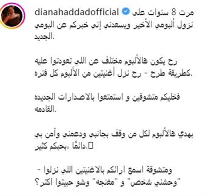 وتابعت ديانا حداد: "بهدي هالألبوم لكل من وقف بجانبي ودعمني وآمن بي دائمًا، بحبكم كثير.. متشوقة أسمع أرائكم بالأغنيتين اللي نزلوا (وحشني شخص) و (مغنجه) وشو حبيتوا اكتر؟".
