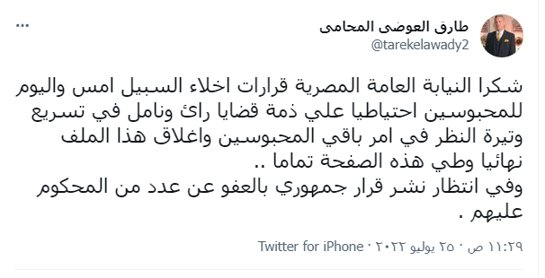 نشر المحامي طارق العوضي عضو لجنة العفو الرئاسي، عبر حسابة الشخصي على "تويتر"، أن هناك قرارات إخلاء سبيل تمت أمس واليوم للمحبوسين احتياطياً على ذمة قضايا رأي.