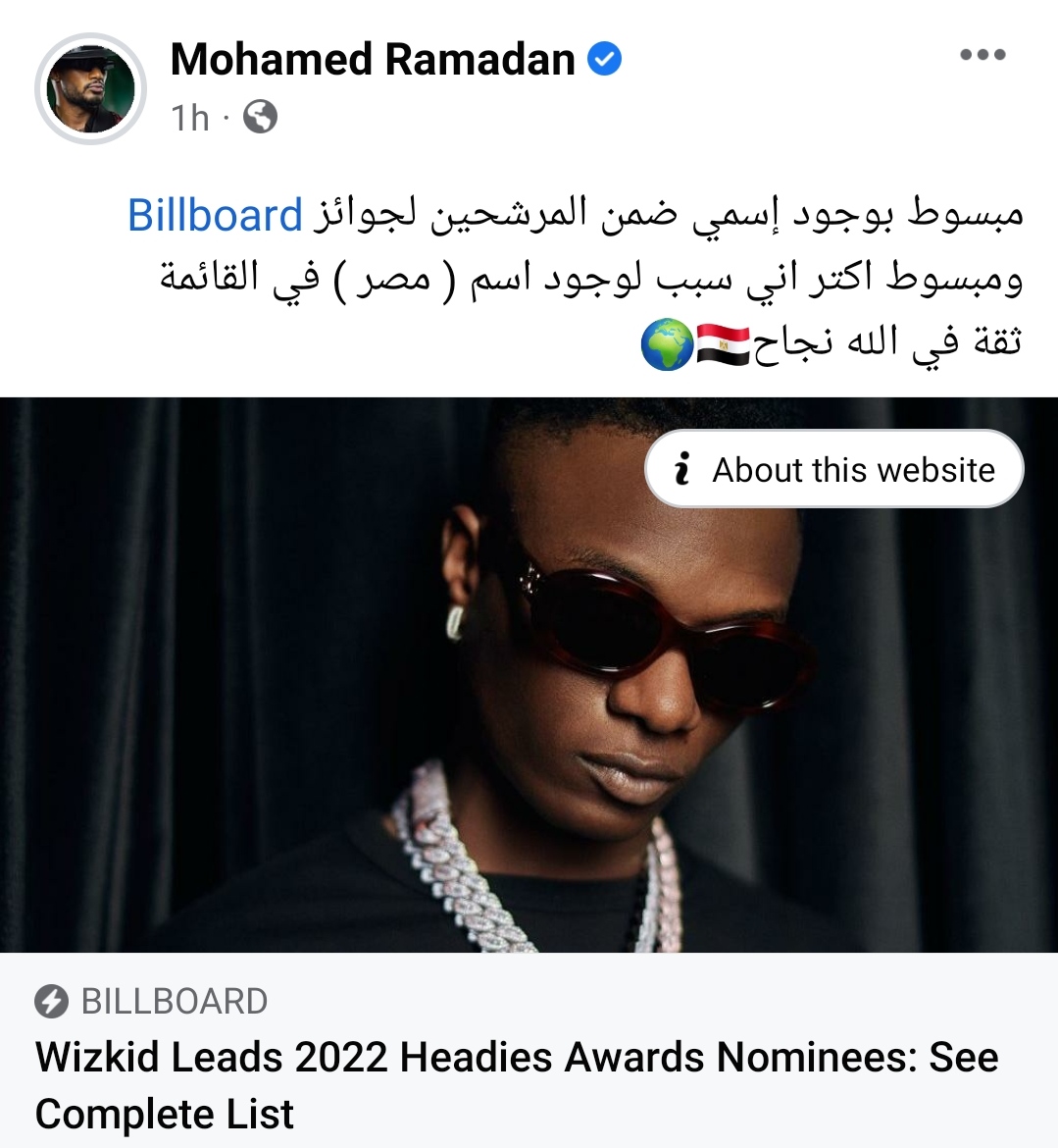 نشر على موقع التواصل الإجتماعي “الفيسبوك” علق قائلاً:" مبسوط بوجود إسمي ضمن المرشحين لجوائز Billboard، ومبسوط أكتر أني سبب لوجود إسم مصر في القائمة، ثقة في الله نجاح".