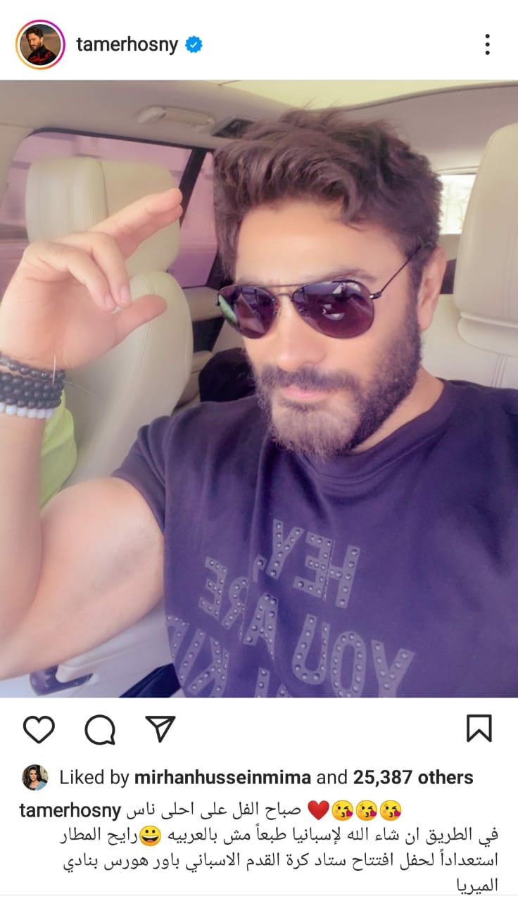 نشر تامر حسني على موقع تبادل الصور والفيديوهات “إنستجرام ” صورة له وهو متجه إلى المطار وعلق عليها قائلاً: " صباح الفل على أحلى ناس .. في الطريق إن شاء الله لإسبانيا طبعاً مش بالعربيه رايح المطار استعداداً لحفل افتتاح ستاد كرة القدم الإسباني باور هورس لنادي ألميريا ".