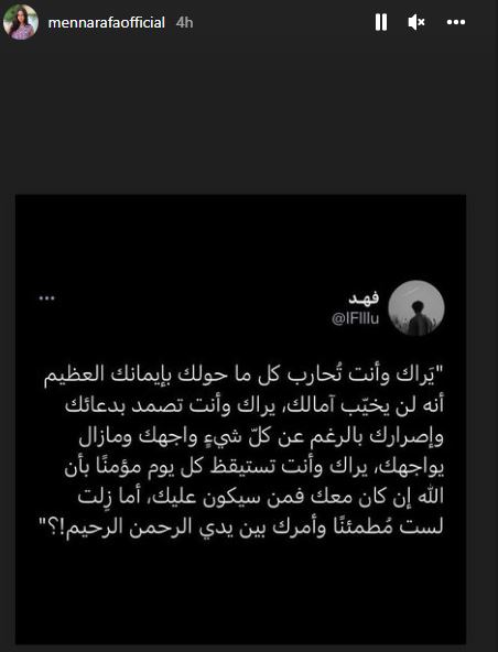 ونشرت منة صورة عبر "ستوري إنستجرام" تحمل عبارة: "يراك الله وأنت تحارب كل ما حولك، بإيمانك العظيم، أنه لن يخيب آمالك، يراك وأنت تصمد بدعائك وإصرارك، بالرغم عن كل شيء واجهك وما زال يواجهك، يراك وأنت تستيقظ كل يوم مؤمنًا بأن الله معك، فمن سيكون عليك، أما زلت لست مطمئنًا وأمرك بين يدي الرحمن الرحيم".