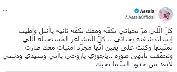 وقالت أصالة عن زوجها فائق حسن،" كلّ الّلي مرّ بحياتي بكفّه ومعك بكفّه تانيه ياأنبل وأطيب إنسان شفته بحياتي .. كلّ المشاعر المُستحيله الّلي تمنّيتها وكنت على يقين إنّها مجرّد أمنيات معك صارت وتحقّقت بأبهى صوره ..ياجوزي ياروحي ياأبي وسيدي ودنيتي لأبعد من حدود السّما بحبك".