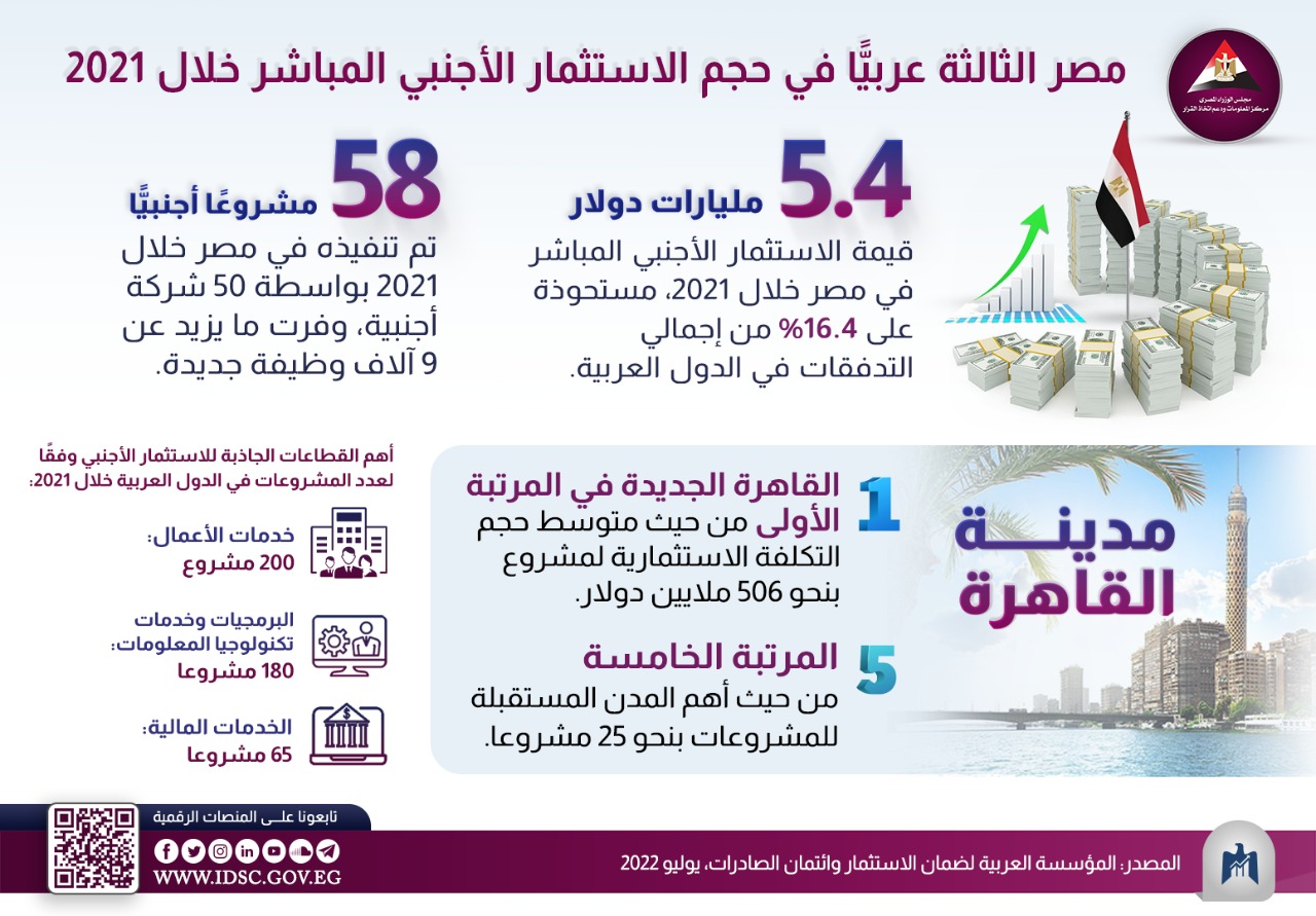 معلومات الوزراء: مصر الثالثة عربيًّا في حجم الاستثمار الأجنبي المباشر خلال 2021