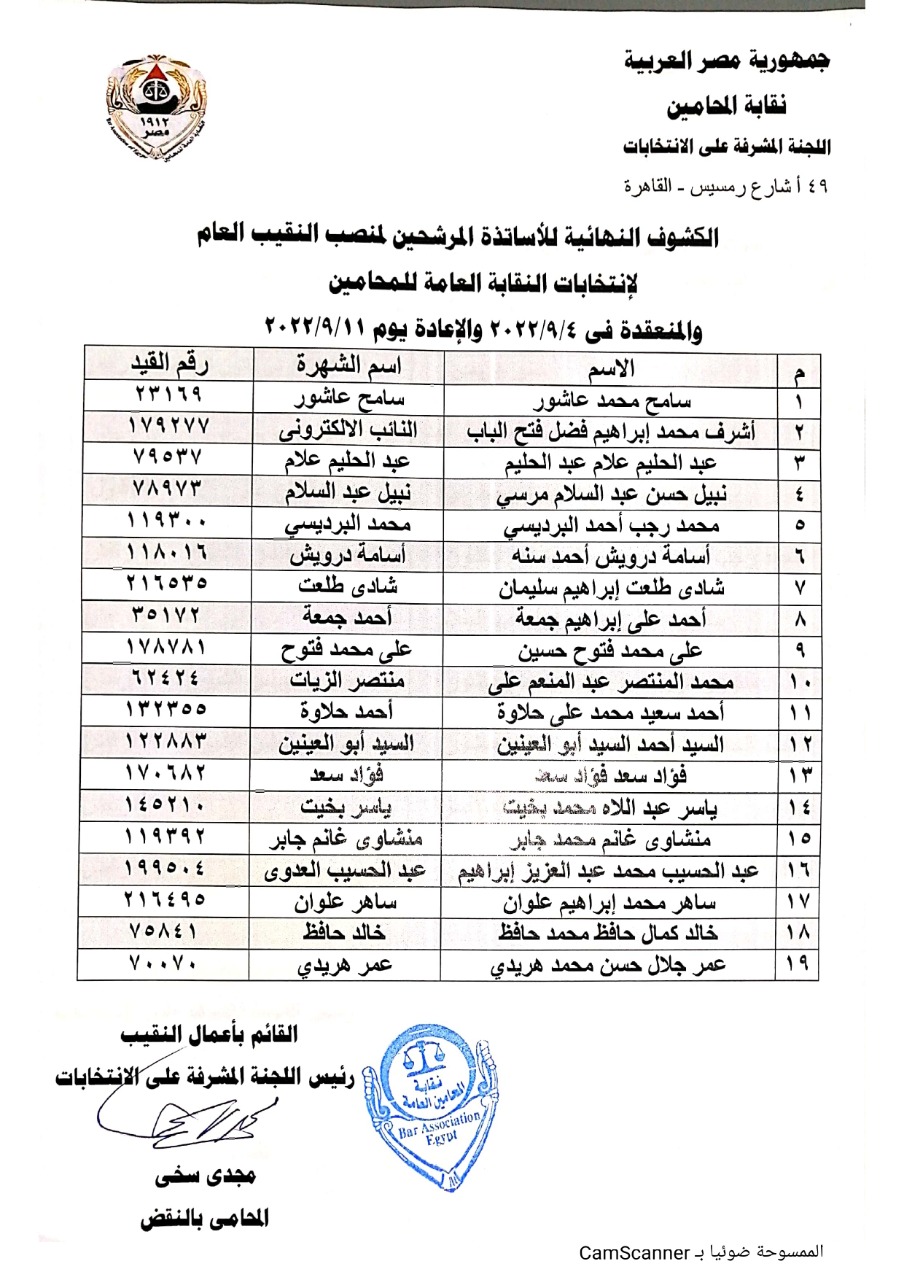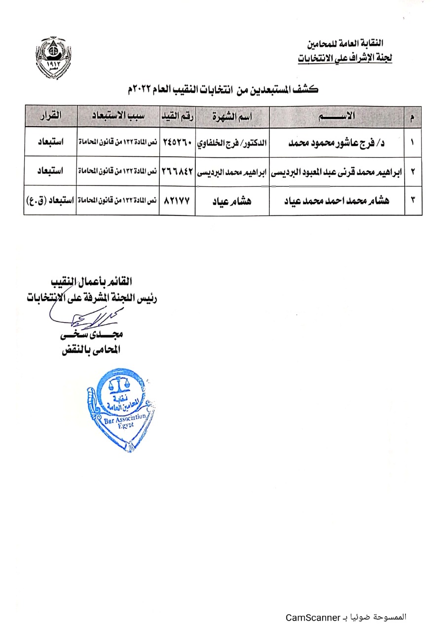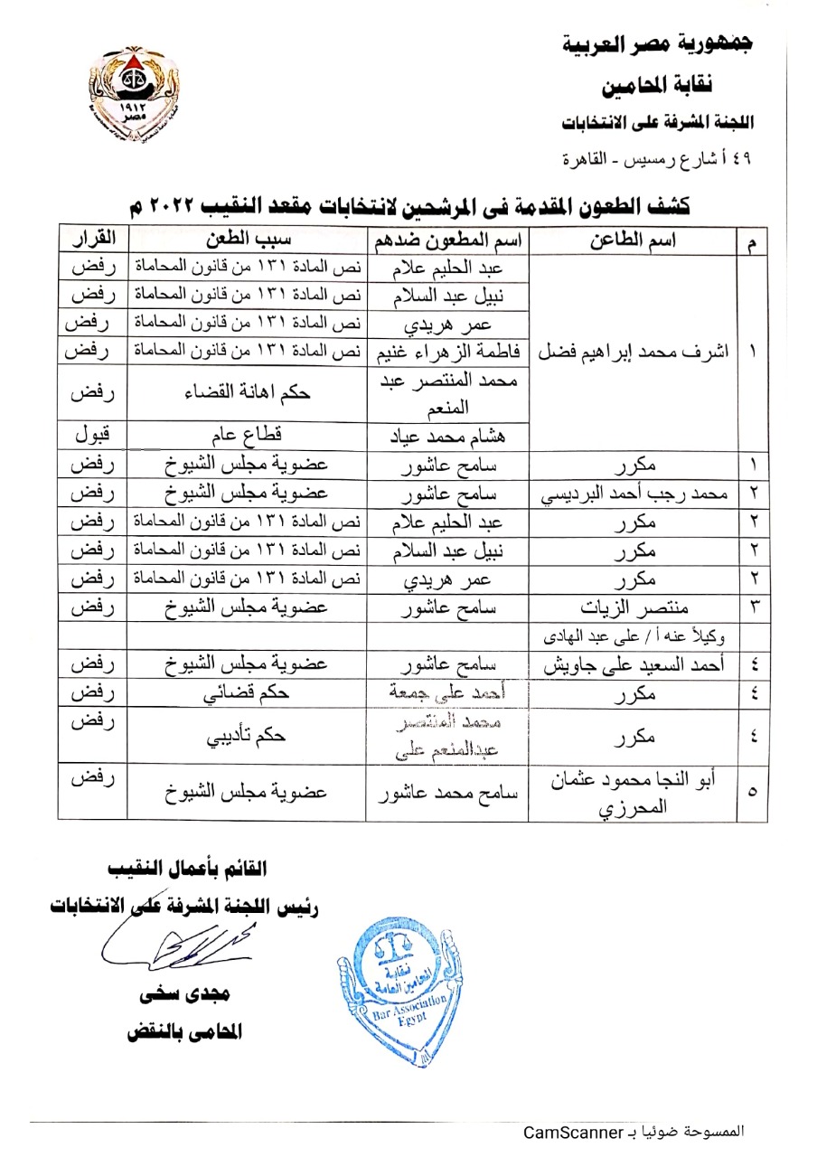 كما تضمن البيان كشفا نهائيا بأسماء المرشحين لمنصب النقيب العام للمحامين، وكشفا بالطعون المقدمة في المرشحين، وكشفا بالمستبعدين من خوض الانتخابات، وآخر للمتنازلين عن الترشح.