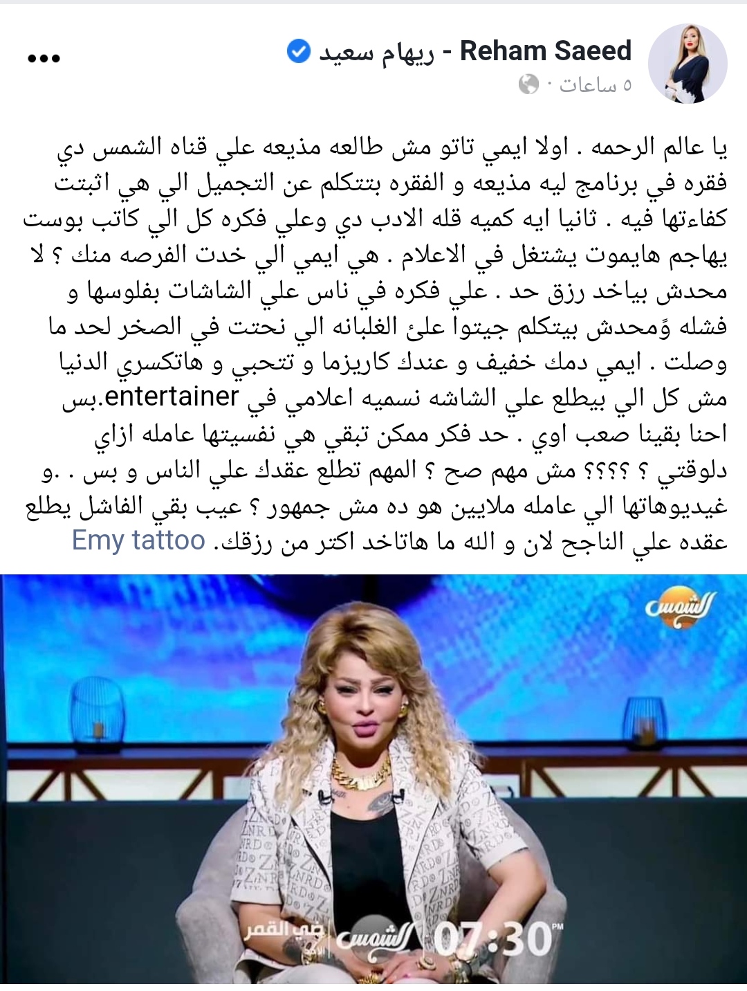 نشرت ريهام سعيد على موقع التواصل الاجتماعي فيسبوك علقت قائلة:" يا عالم الرحمه أولا إيمي تاتو مش طالعة مذيعة علي قناة الشمس دي فقرة في برنامج ليه مذيعة.. و الفقرة بتتكلم عن التجميل إلي هي أثبتت كفاءتها فيه ".