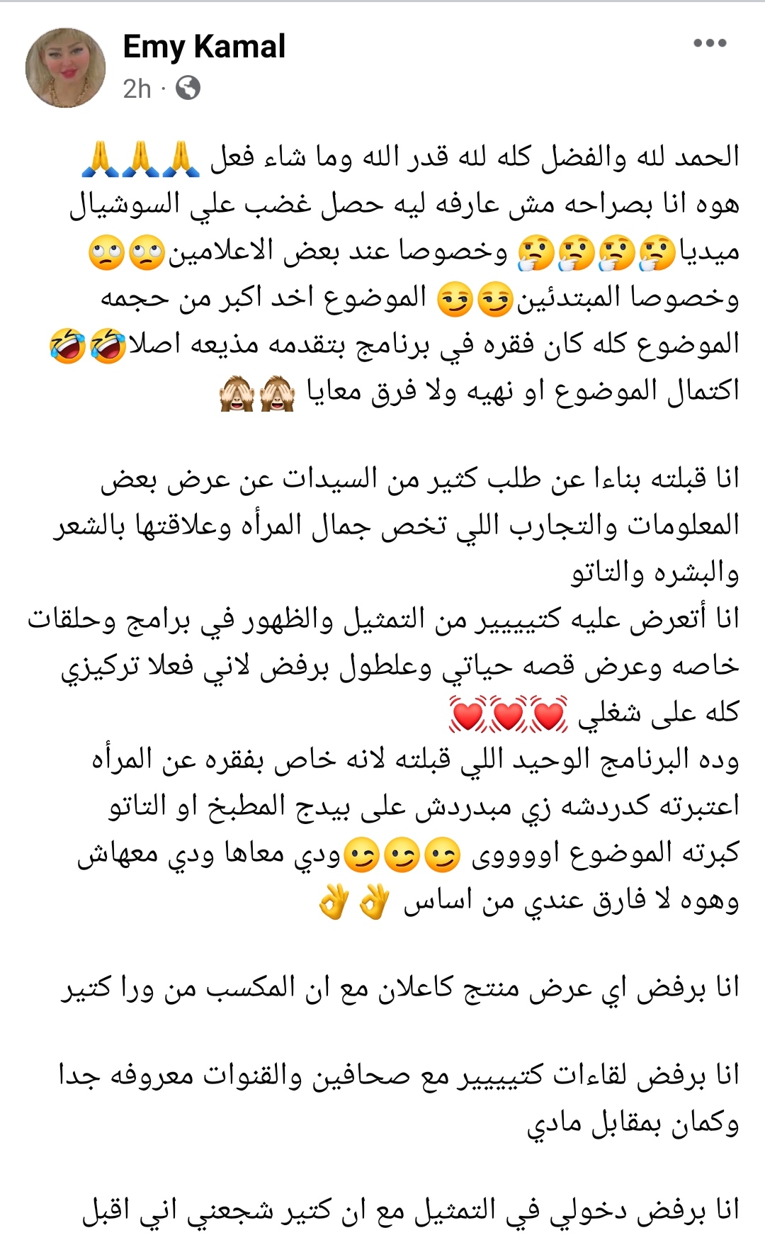 تابعت إيمي تاتو " انا قبلته بناءا عن طلب كثير من السيدات عن عرض بعض المعلومات والتجارب اللي تخص جمال المرأه وعلاقتها بالشعر والبشره والتاتو ".