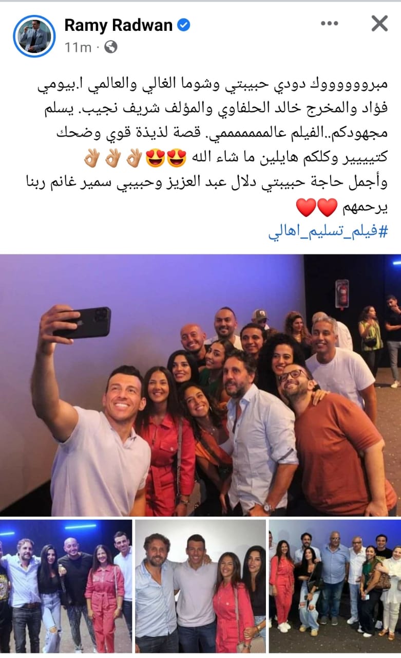 نشر رامي رصوان على صفحته على موقع التواصل الإجتماعي"الفيسبوك"، قائلاً:"مبرووووووك دودي حبيبتي وشوما الغالي والعالمي بيومي فؤاد والمخرج خالد الحلفاوي والمؤلف شريف نجيب، يسلم مجهودكم، الفيلم عالمي، قصة لذيذة قوي وضحك كتيييير وكلكم هايلين ما شاء الله، وأجمل حاجة حبيبتي دلال عبد العزيز وحبيبي سمير غانم ربنا يرحمهم ، فيلم تسليم أهالي".