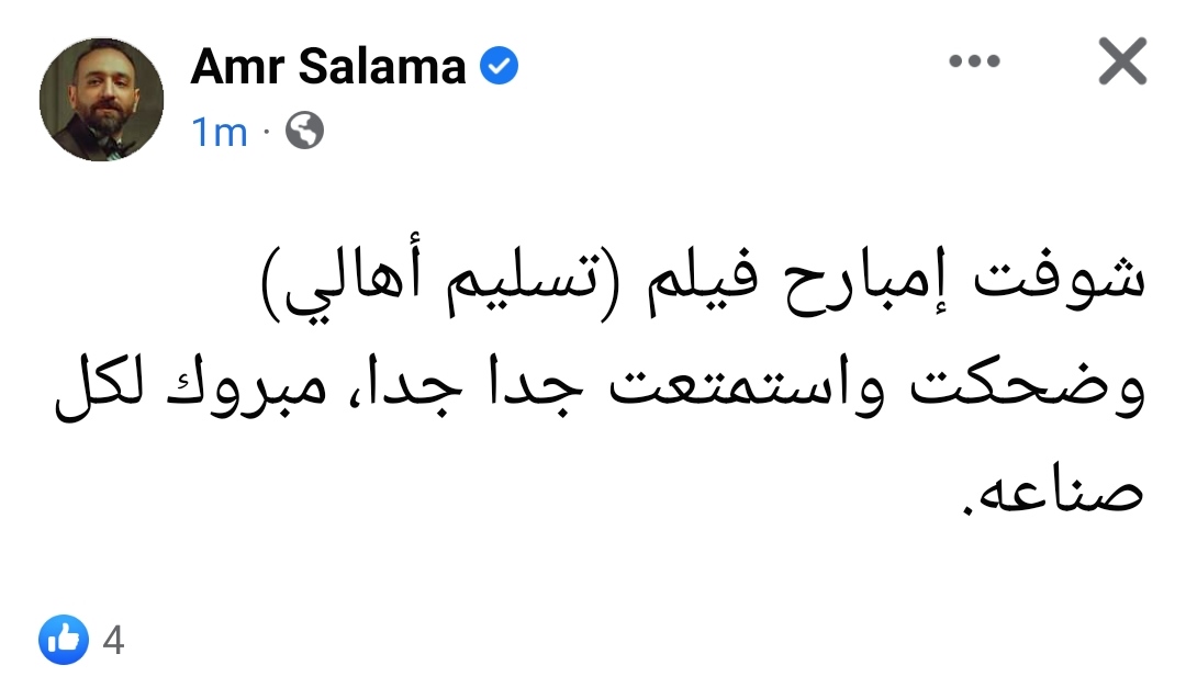 نشر عمرو سلامة على موقع التواصل الإجتماعي “الفيسبوك” قائلاً:" شوفت إمبارح فيلم تسليم أهالي وضحكت واستمتعت جدا جدا، مبروك لكل صناعة".