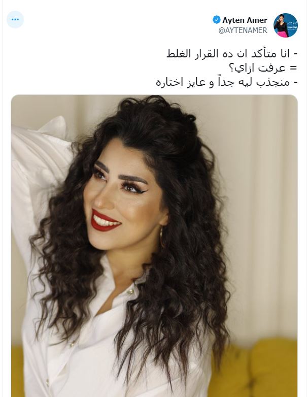 ونشرت آيتن عامر منشور غامض لها عبر صفحتها الشخصية علي موقع التواصل الاجتماعي " تويتر" أثار حيرة جمهورها حيث علقت علي صورة لها قائلة " انا متأكد ان ده القرار الغلط.. عرفت ازاي؟.. منجذب ليه جداً و عايز اختاره".