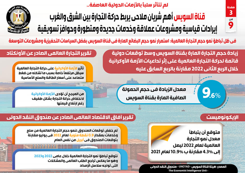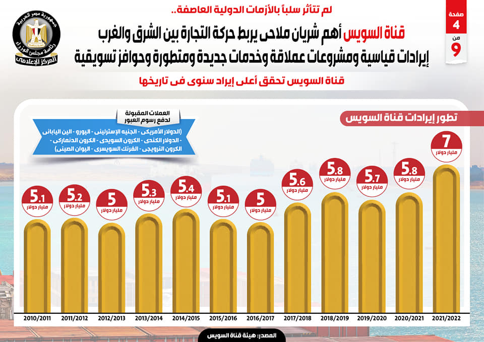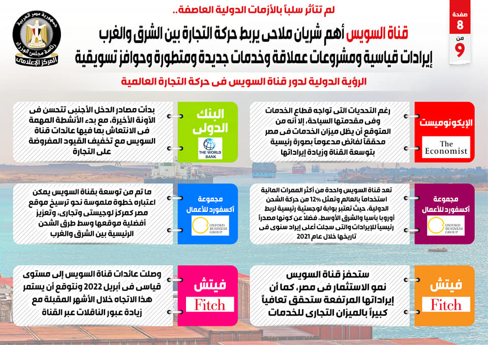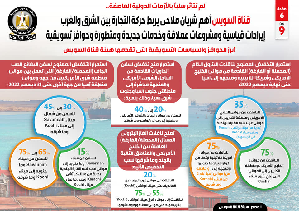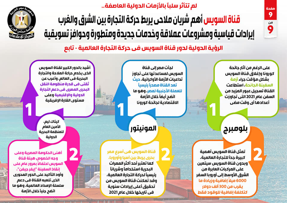 وفي هذا الصدد نشر المركز الإعلامي لمجلس الوزراء تقريراً تضمن إنفوجرافات تسلط الضوء على قناة السويس كأهم شريان ملاحي يربط حركة التجارة بين الشرق والغرب، وينجح في تحقيق إيرادات قياسية ومشروعات عملاقة مع توفير خدمات جديدة ومتطورة وحوافز تسويقية، ولم يتأثر سلباً بالأزمات الدولية العاصفة.