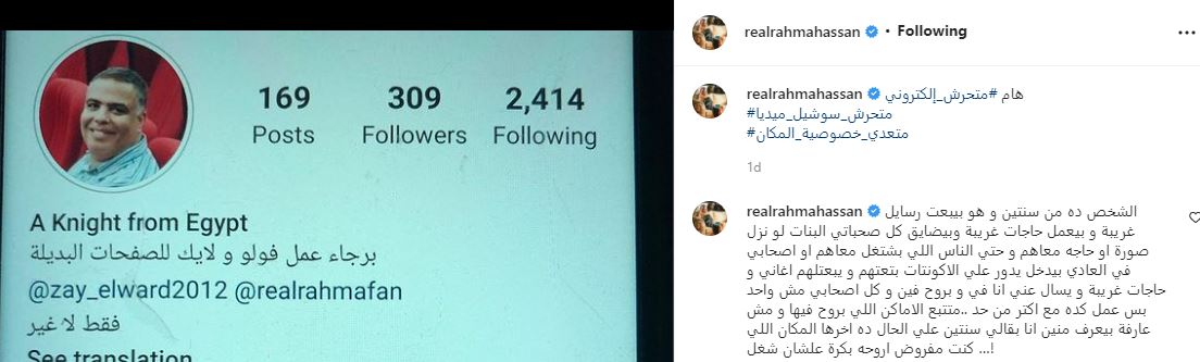 وقالت رحمة حسن عبر صفحتها الشخصية علي موقع التواصل الاجتماعي ،" انستجرام"،" الشخص ده من سنتين و هو بيبعت رسايل غريبة و بيعمل حاجات غريبة وبيضايق كل صحباتي البنات لو نزل صورة او حاجه معاهم و حتي الناس اللي بشتغل معاهم او اصحابي في العادي بيدخل يدور علي الاكونتات بتعتهم و يبعتلهم اغاني و حاجات غريبة و يسال عني انا في و بروح فين و كل اصحابي مش واحد بس عمل كده مع اكتر من حد".