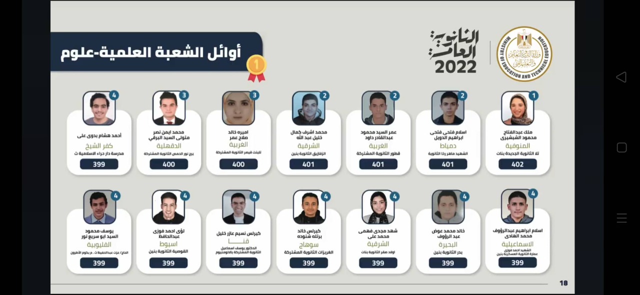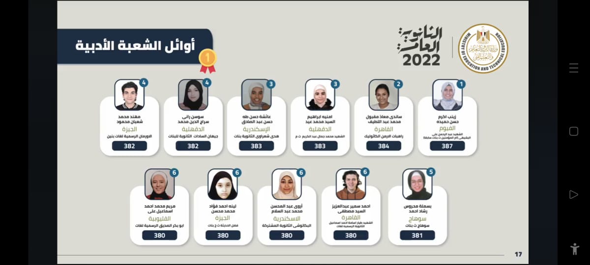 أعلن الدكتور طارق شوقي وزير التربية والتعليم والتعليم الفنى عن نسبة نجاح فى الثانوية العامة للشعبتين الادبي والعلمي 75%، وأكد وزير التعليم أن نسبة النجاح فى الشعبة الأدبية وهى أقل من العام الماضي حيث بلغت 68%، وأعلن عن أوائل الثانوية العامة فى الشعبة الأدبية وهم 11 طالب كما هو موضح بالصورة