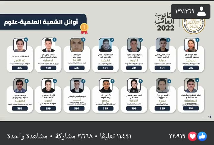 وأكد وزير التعليم أن نسبة النجاح فى الشعبة الأدبية وهى أقل من العام الماضي حيث بلغت 68%، وأعلن عن أوائل الثانوية العامة فى الشعبة العلمية علوم
