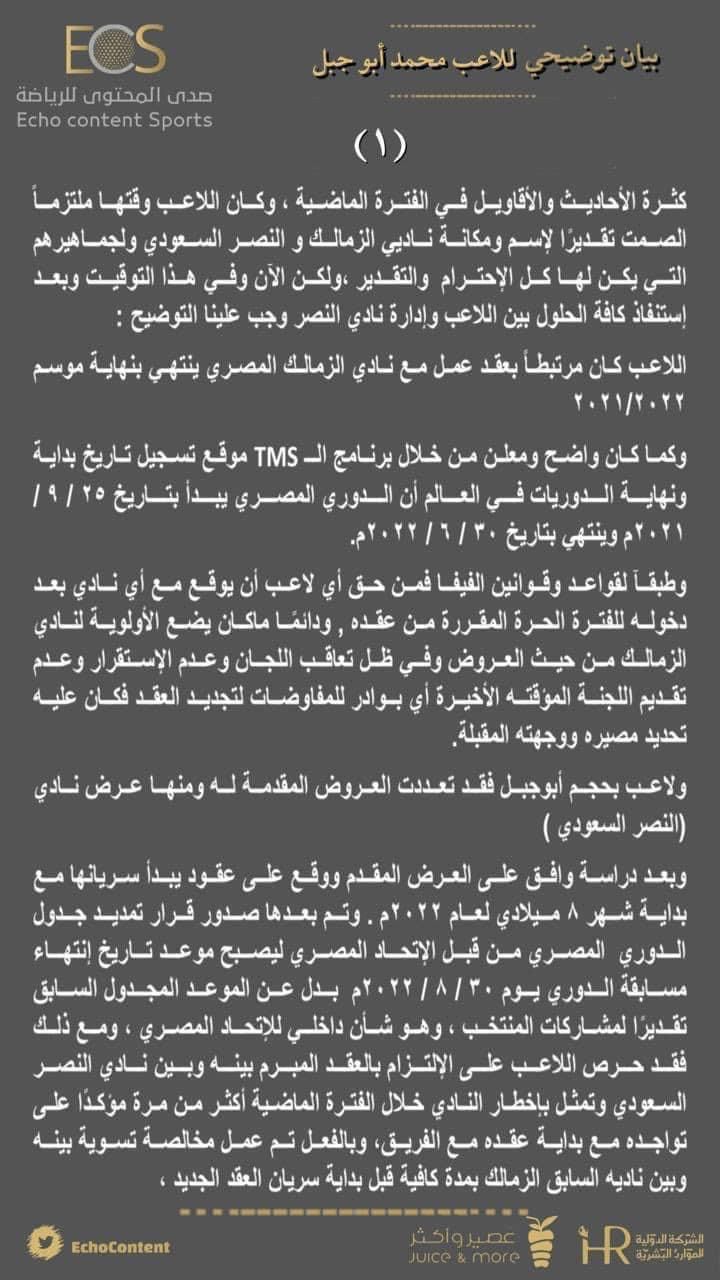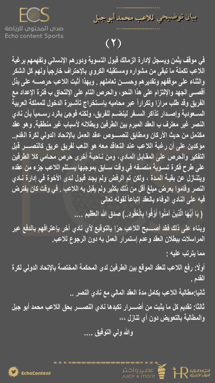 وقال أبو جبل في بيان له، تولت إحدى شركات التسويق السعودية نشره، إنه يطالب بعقده كاملًا مع نادي النصر، في ظل رغبة النادي السعودي في إنهاء التعاقد.