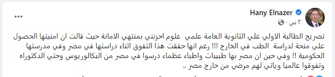 وقال هاني الناظر رداً علي الطالبة :" تصريح الطالبة الاولي علي الثانوية العامة علمي علوم احزنني بمنتهي الامانة حيث قالت ان امنيتها الحصول علي منحة لدراسة الطب في الخارج !!! رغم انها حققت هذا التفوق اثناء دراستها في مصر وفي مدرستها الحكومية !! وفي حين ان مصر بها طبيبات واطباء عظماء درسوا في مصر من البكالوريوس وحتي الدكتوراه وتفوقوا عالميا وياتي لهم مرضي من خارج مصر".