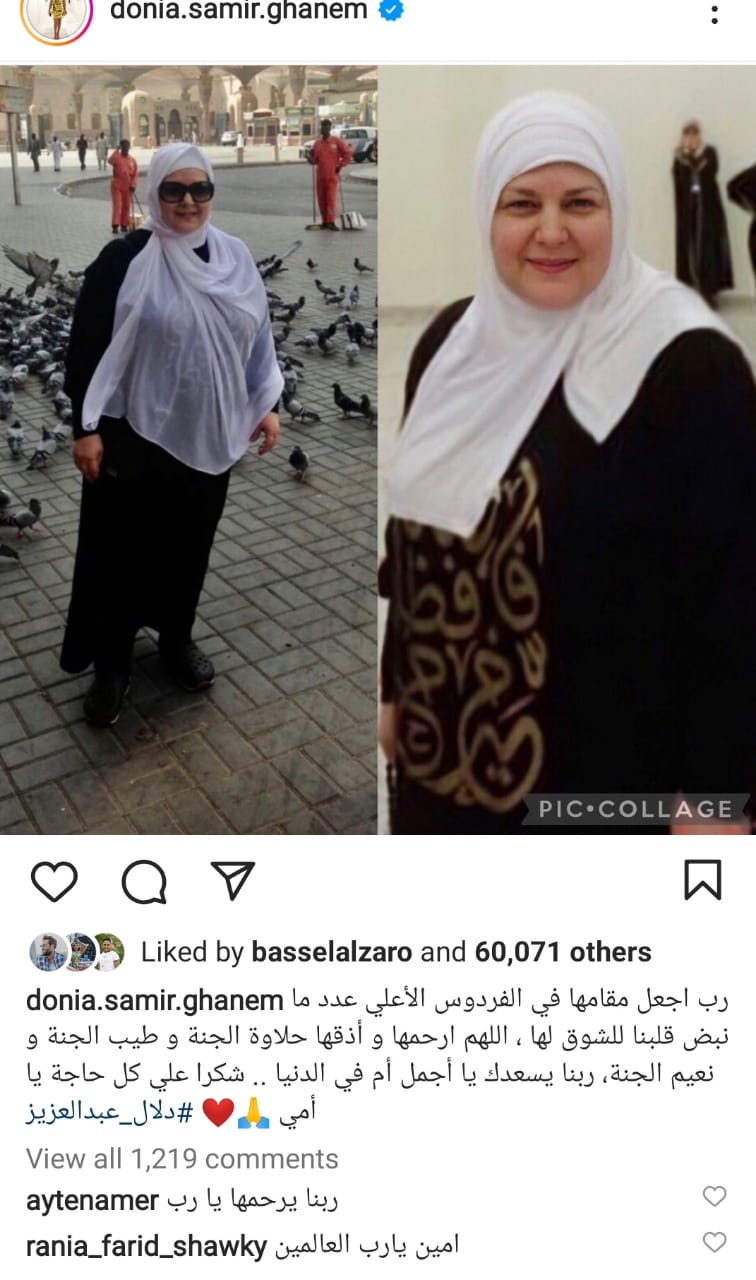نشرت دنيا سمير غانم على صفحتها على موقع تبادل الصور والفيديوهات “إنستجرام” علقت قائلة:"رب اجعل مقامها في الفردوس الأعلي عدد ما نبض قلبنا للشوق لها، اللهم ارحمها وأذقها حلاوة الجنة و طيب الجنة و نعيم الجنة، ربنا يسعدك يا أجمل أم في الدنيا، شكرا علي كل حاجة يا أمي".
