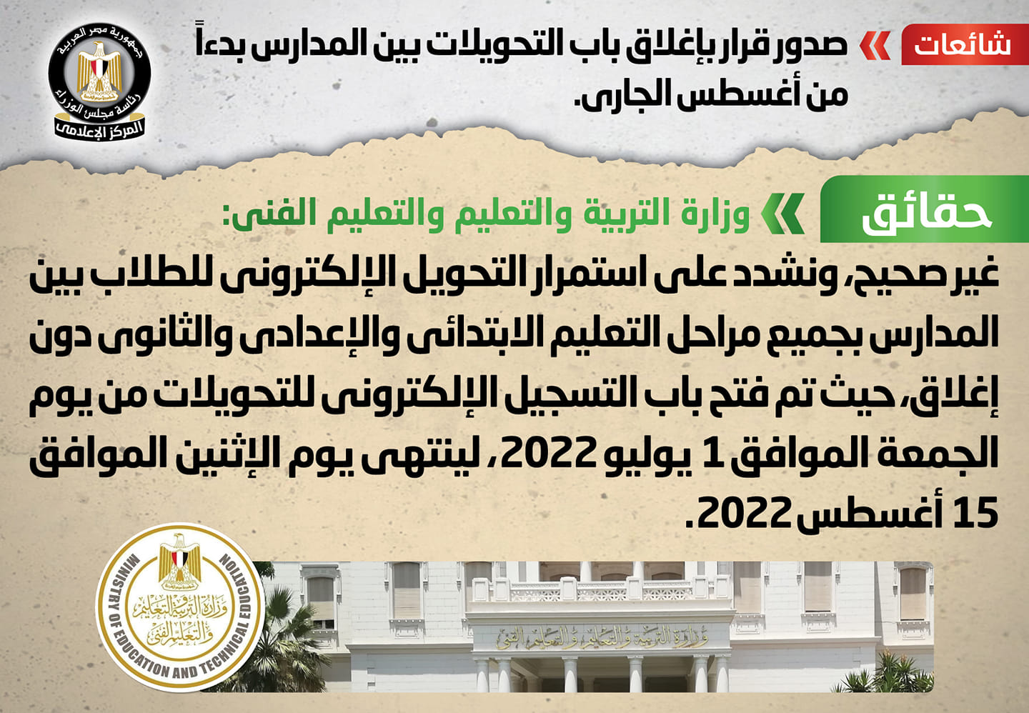 قام المركز الإعلامي لمجلس الوزراء بالتواصل مع وزارة التربية والتعليم والتعليم الفني، والتي نفت تلك الأنباء، مُؤكدةً أنه لا صحة لإغلاق باب التحويلات بين المدارس بدءاً من شهر أغسطس الجاري، مُشددةً على استمرار التحويل الإلكتروني للطلاب بين المدارس بجميع مراحل التعليم الابتدائي والإعدادي والثانوي دون إغلاق، حيث تم فتح باب التسجيل الإلكتروني للتحويلات من يوم الجمعة الموافق 1 يوليو 2022، لينتهي يوم الإثنين الموافق 15 أغسطس 2022.
