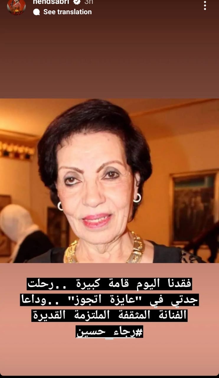 نعت الفنانة التونسية هند صبري، الفنانة الراحلة رجاء حسين التي وافتها المنية صباح اليوم بعد صراع مع المرض عن عمر ناهز 84 عامًا ، والتي أثار رحيلها فذع الوسط الفني وفي قلوب محبيها.