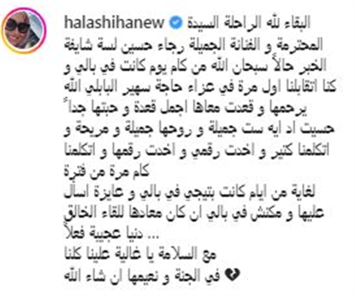 وكتبت حلا شيحة: "البقاء لله الراحلة السيدة المحترمة والفنانة الجميلة رجاء حسين، لسه شايفة الخبر حالاً، سبحان الله من كام يوم كانت في بالي و كنا اتقابلنا أول مرة في عزاء حاجة سهير البابلي الله يرحمها وقعدت معاها أجمل قعدة وحبتها جدا".