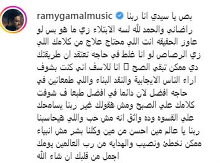 وتابع رامي جمال: "وده واثق أنه مش حب، واللي هيحسابنا ربنا، يا عالم مين أحسن من مين، وكلنا بشر مش أنبياء، ممكن نخطئ ونصيب والهداية من رب العالمين، يومك أجمل من قلبك إن شاء الله".