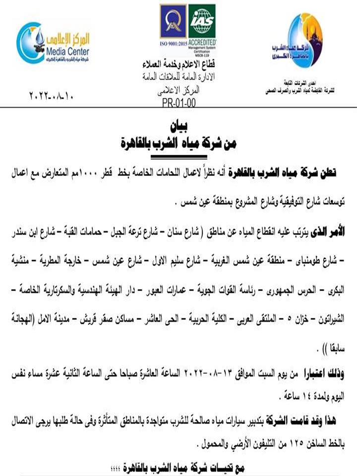 الامر الذي يترتب عليه انقطاع المياه عن مناطق "شارع سنان ـ شارع ترعة الجبل ـ حمامات القبة ـ شارع ابن سندر ـ شارع طومنباى ـ منطقة عين شمس الغربية ـ شارع سليم الاول ـ شارع عين شمس ـ خارج المطرية ـ منشية البكري ـ الحرس الجمهورى ـ رئاسة القوات الجوية ـ عمارات العبور ـ دار الهيءة الهندسية والسكرتارية الخاصة ـ الشيراتون ـ خزان 5 ـ الملتقي العربي ـ الكلية الحربية ـ الحي العاشر ـ مساكن صقر قريش ـ مدينة الامل ـ الهجانة سابقاًو".
