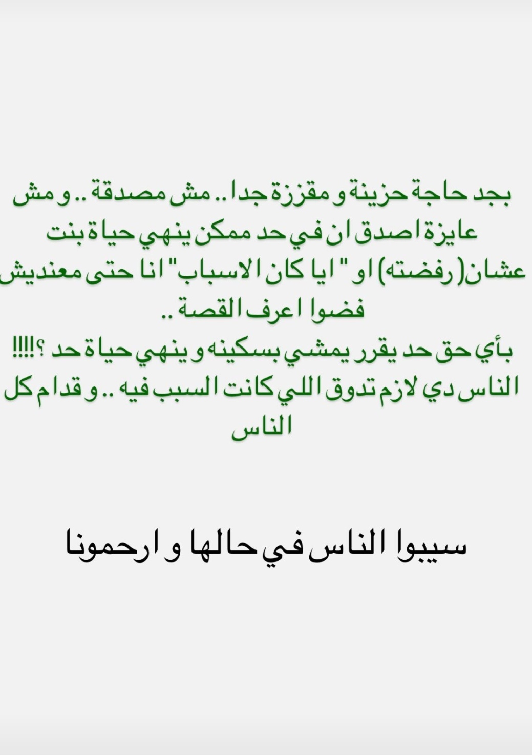 وتابعت أسماء جلال:" أنا حتى معنديش فضول أعرف القصة بأي حق حد يقرر يمشي بسكينة ينهي حياة حد!!! الناس دي لازم تدوق اللي كانت السبب فيه، وقدام كل الناس، سيبوا الناس في حالها وارحمونا".