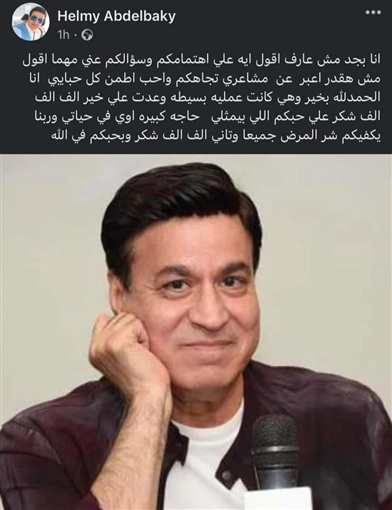 وكتب حلمي عبد الباقي عبر حسابه بموقع التواصل الاجتماعي فيس بوك: "أنا بجد مش عارف أقول إيه على اهتمامكم وسؤالكم عني مهما أقول مش هقدر أعبر عن مشاعري تجاهكم وأحب أطمن كل حبايبي أنا الحمد لله بخير".