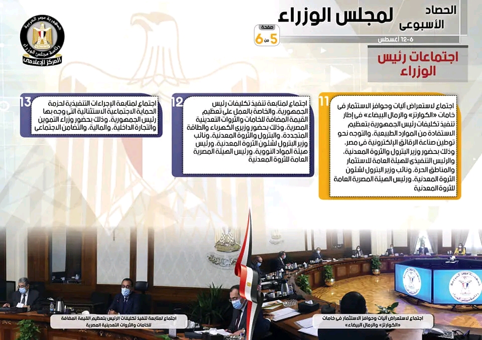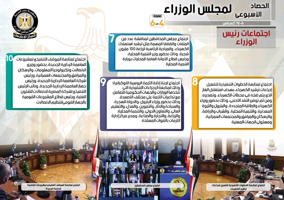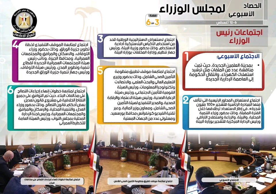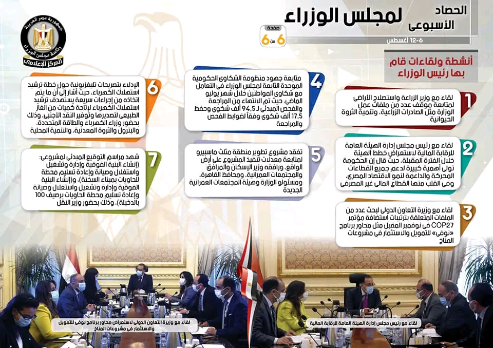 نشر المركز الإعلامي لمجلس الوزراء، تقريراً شمل إنفوجرافات سلط من خلالها الضوء على الحصاد الأسبوعي لمجلس الوزراء، وذلك خلال الفترة من 6 حتى12 أغسطس 2022، والذي تضمن الموافقة على عدد من القرارات، فضلاً عن الاجتماعات واللقاءات التي عقدها الدكتور مصطفى مدبولي، رئيس مجلس الوزراء، بالإضافة إلى ما قام به سيادته من أنشطة.
