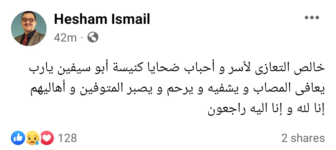 ونشر هشام اسماعيل على موقع التواصل الإجتماعي “الفيس بوك” علق قائلا:" خالص التعازي لأسر وأحباب ضحايا كنيسة أبو سيفين يارب يعافي المصاب ويشفيه ويرحم و يصبر المتوفين وأهاليهم..إنا لله لاوإنا إليه راجعون".