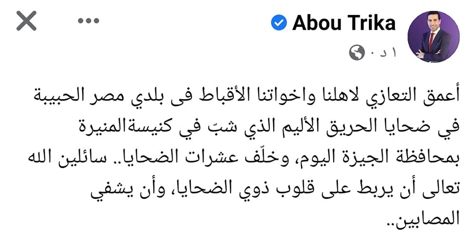 وكتب محمد أبوتريكة عبر صفحته الرسمية بموقع “تويتر”، “أعمق التعازي لاهلنا واخواتنا الأقباط فى بلدي مصر الحبيبة في ضحايا الحريق الأليم الذي شبّ في كنيسة المنيرة بمحافظة الجيزة اليوم، وخلّف عشرات الضحايا.. سائلين الله تعالى أن يربط على قلوب ذوي الضحايا، وأن يشفي المصابين”.
