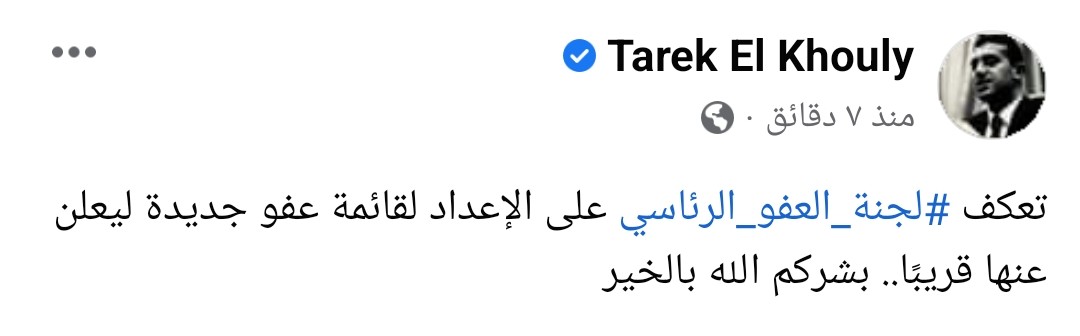 أعلن النائب طارق الخولي، عضو مجلس النواب عن تنسيقية شباب الأحزاب والسياسيين وعضو لجنة العفو الرئاسي، إن لجنة العفو الرئاسي تعكف على الإعداد لقائمة عفو جديدة ليعلن عنها قريبًا بشركم الله بالخير.