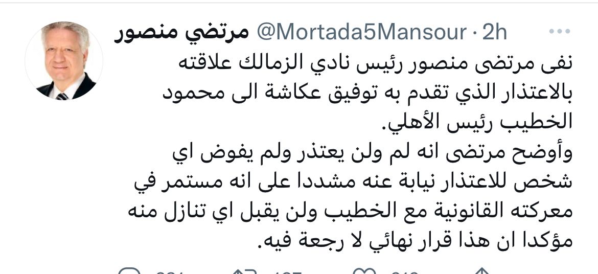 نفى مرتضى منصور رئيس نادي الزمالك علاقته بالاعتذار الذي تقدم به توفيق عكاشة الى محمود الخطيب رئيس الأهلي.