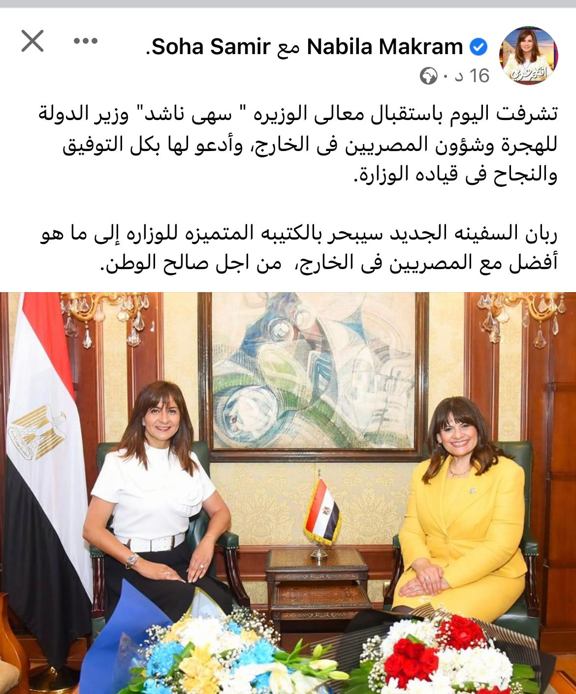 وأضافت نبيلة مكرم عبر صفحتها الشخصية على موقع التواصل الاجتماعي فيسبوك، أن تشرفت اليوم باستقبال الوزيرة سها جندي وزير الدولة للهجرة وشؤون المصريين في الخارج، وأدعو لها بكل التوفيق والنجاح في قيادة الوزارة.