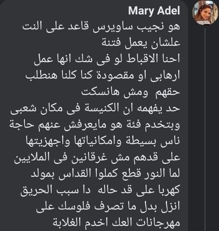 وقالت الفتاة فى منشورها المتداول عبر السوشيال ميديا ،" هو نجيب ساويرس قاعد على النت علشان يعمل فتنة احنا الأقباط لو كان فى شك انه عمل إرهابي أو مقصود مكناش هنسكت.. حد يفهمه ان الكنيسة فى مكان شعبي وبتخدم فئة بسيطة وامكانيتها وأجهزتها على قدهم مش غرقانين فى الملايين.. بدل ما تصرف فلوسك على المهرجانات العك اخدم الغلابة".