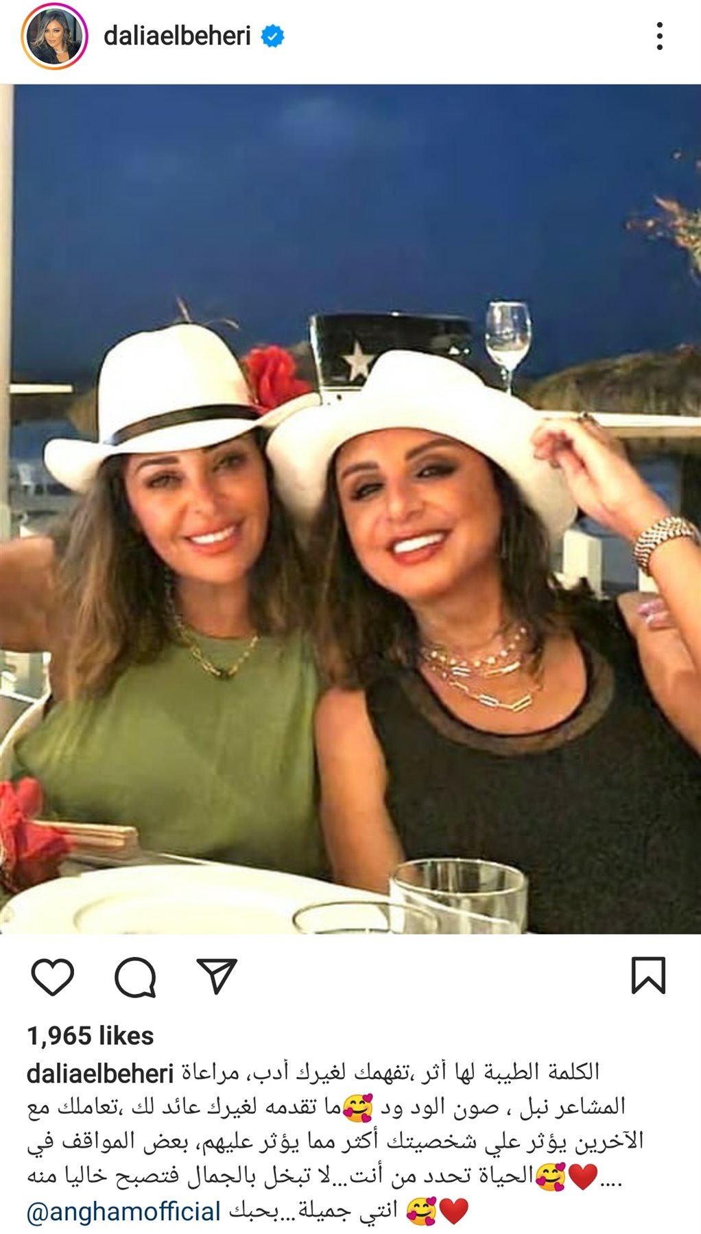 بعد إنهاء الخلاف بين الفنانة داليا البحيري، والفنانة أنغام وجهت داليا البحيري لها رسالة مليئة بالحب و الود، وذلك على موقع تبادل الصور والفيديوهات" إنستجرام ".