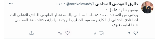 وكتب المحامي طارق العوضي عبر صفحته الرسمية بموقع “تويتر”، وردني من محمد عثمان المحامي والمستشار القانوني للنادي الاهلي الان ان النادي الاهلي او الكابتن محمود الخطيب لم يتقدموا باية بلاغات ضد الصحفي عبداللطيف فوزي، وان الامر لا علاقة له بالنادي الاهلي او الكابتن محمود الخطيب".