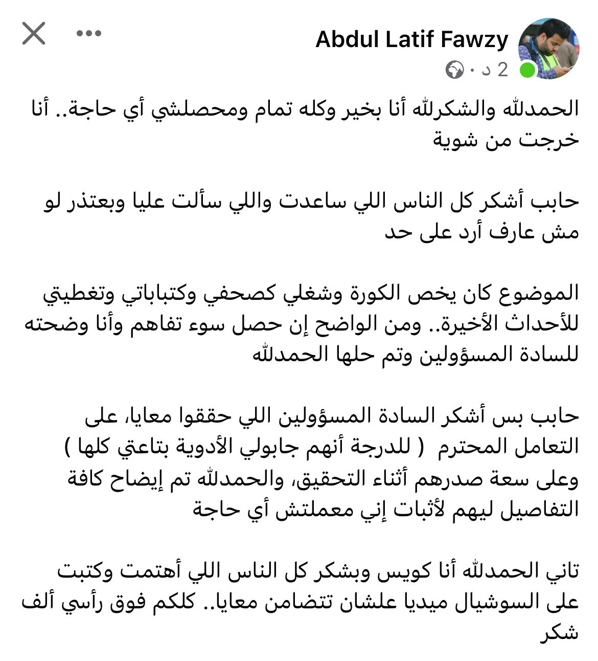 وكتب عبد اللطيف فوزي المحلل بقناة الزمالك عبر صفحته الشخصية بموقع “فيس بوك”، "الحمدلله والشكرلله أنا بخير وكله تمام ومحصلشي أي حاجة.. أنا خرجت من شوية، حابب أشكر كل الناس اللي ساعدت واللي سألت عليا وبعتذر لو مش عارف أرد على حد، الموضوع كان يخص الكورة وشغلي كصحفي وكتاباتي وتغطيتي للأحداث الأخيرة.. ومن الواضح إن حصل سوء تفاهم وأنا وضحته للمسؤولين وتم حلها الحمدلله".